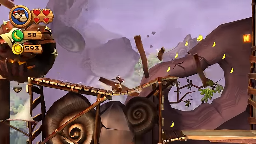 Partially hidden inside a wooden building. Jump from the collapsing platform, or use an enemy as a stepping stone on the tilting platform.